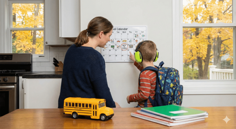 Put up a calendar with the back to school date circled. For a couple of weeks prior to the first day, talk to your child each day about going back to school and what to expect. For some children, a social story would be helpful for them to review independently or with their parents. Incorporate pictures of their classroom, teachers, and peers as often as possible.